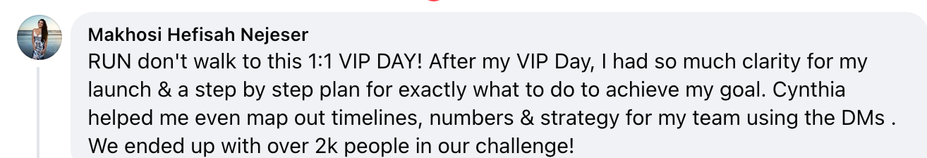 With Cynthia’s expert eyes on your content, offers, pricing, and client journey — you’ll uncover fast cash opportunities. One client made 50% of her prior year’s revenue in the 30 days after her VIP day.